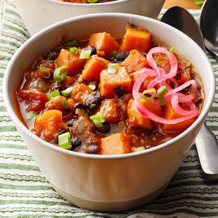 From the Recipe Creator: My whole family enjoys this sweet potato black bean chili, but my daughter especially loves it. I like to make it because it’s so easy and very flavorful. —Joy Pendley, Ortonville, Michigan