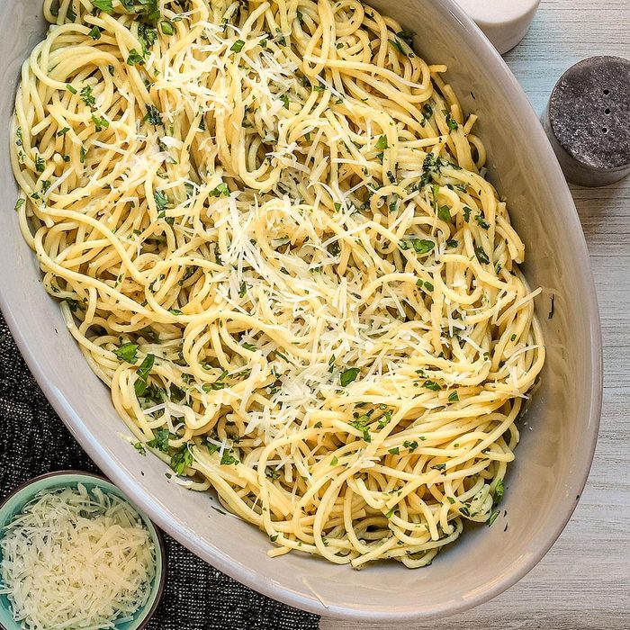 I make this family-favorite garlic spaghetti—or spaghetti aglio e olio—at least a couple of times a month. It's wonderful with a salad and fresh Italian bread. Add red pepper flakes to give it a bit of heat or finish with a sprinkle of fresh parsley. —Jackie Messina, Chardon, Ohio