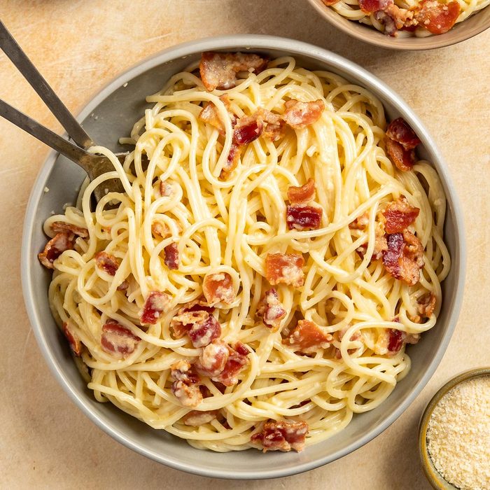 Spaghetti Alla Carbona is a classic Italian recipe. The key is to use the hot pasta water to make the dish creamy. The dish is luxurious, satisfying, comforting, and easy to make! —Luisa Webb, Fort Collins, Colorado