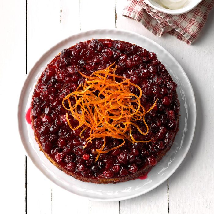 This showstopping treat may look complicated, but it’s very easy to make in just a few steps. You’ll end up with a vibrant cake-like cranberry dessert with wonderful seasonal flavor. Garnish with plenty of orange zest, and serve each slice with whipped cream.