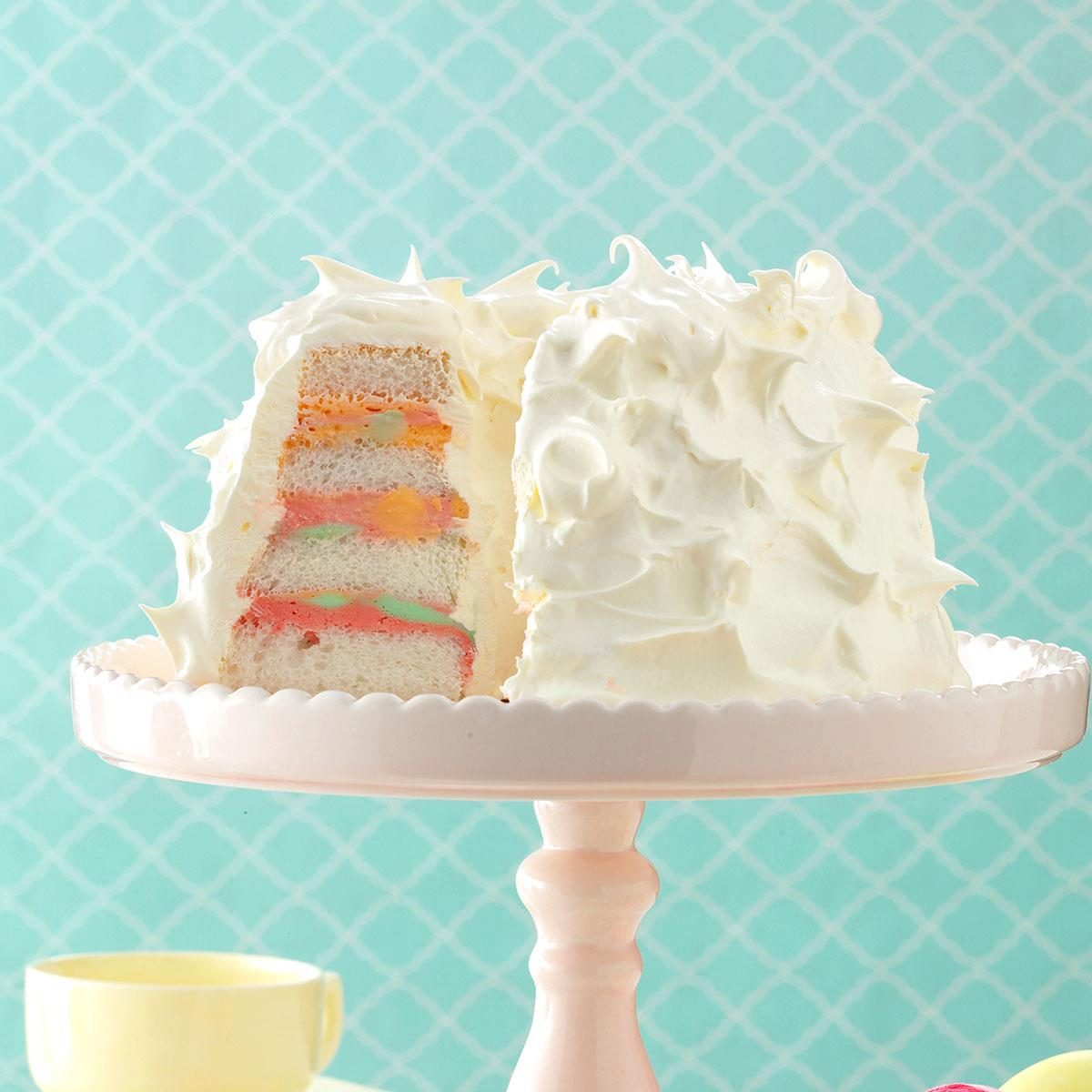 This Rainbow Sherbet Angel Food Cake looks way fancier than its five ingredients would have you believe! Simply slice your angel food cake horizontally, layer with your favorite rainbow colors of sherbet, and frost the top and sides with spiky whipped cream.