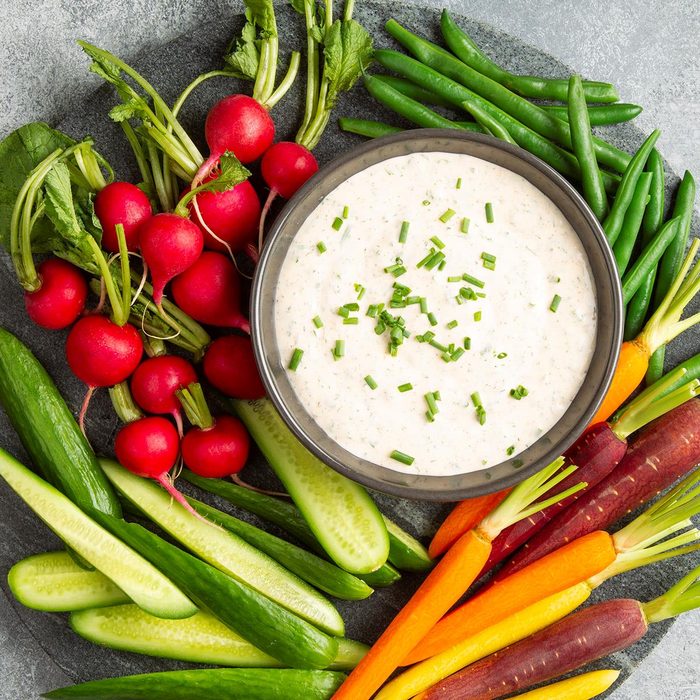 The buttermilk tang of ranch dressing can be made vegan! Simply dash cider vinegar into your favorite plant-based milk, thicken with vegan mayo and add plenty of fresh herbs. This dressing makes a delicious salad topper or dip.