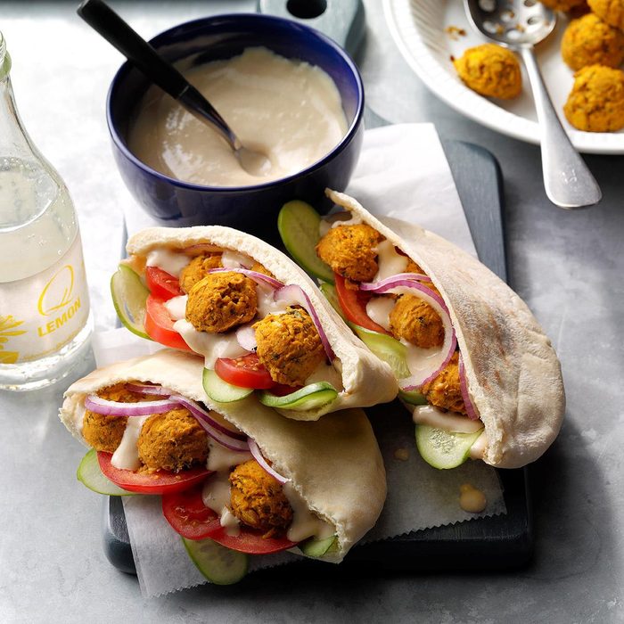 Falafel is the ultimate Middle Eastern street food. Pumpkin adds a light sweetness and keeps the patties moist while baking. Top these beauties with a sweet and savory maple tahini sauce. You can serve them sandwich-style, as an appetizer over a bed of greens, or with soup and salad. —Julie Peterson, Crofton, Maryland