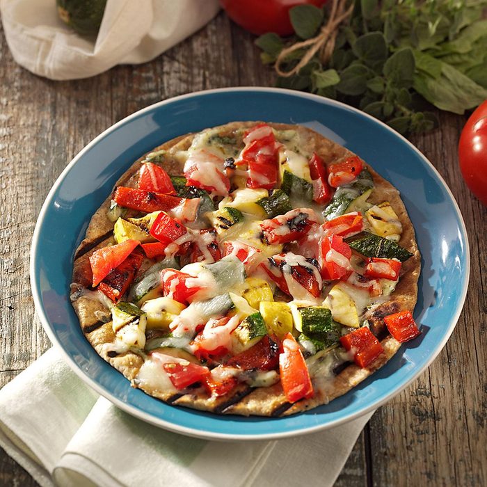 I came up with this recipe one summer as a way to use up vegetables from our garden. Grilling the veggies first brings out their sizzling flavors. Try it with a sprinkling of olives or pine nuts before adding the cheese. —Susan Marshall, Colorado Springs, Colorado