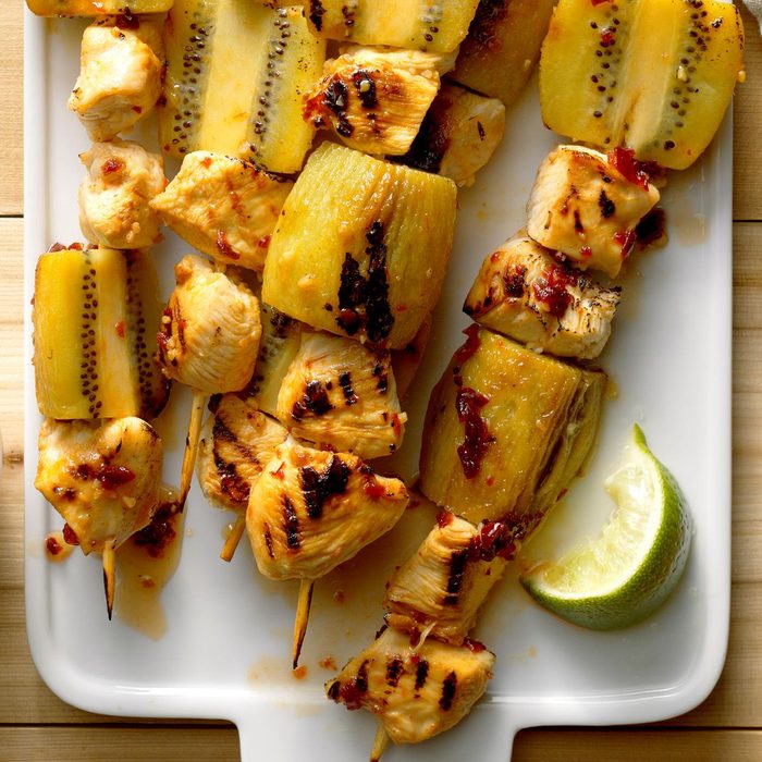 When guests bite into these juicy grilled kabobs, their eyes always widen with satisfaction. Our four kids are crazy about the spicy-sweet sauce. —Joni Hilton, Rocklin, California