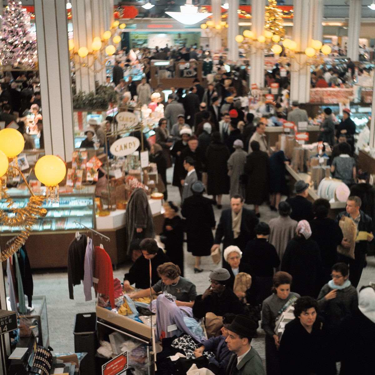 Photos of busy shops like this definitely make us grateful that online shopping is possible these days! However, we do miss those department store candy counters and lunch menus.