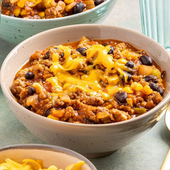 This turkey chili easily turns into a vegetarian dish by leaving out the meat or replacing it with soy crumbles. A topping of goat cheese makes this full-flavored chili stand out from others. —Patricia Burk, North Canton, Ohio