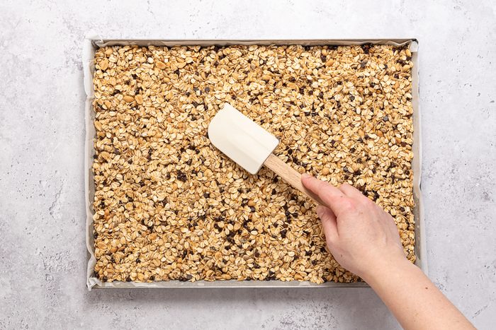 - Preheat oven to 350°. In a large bowl, combine oats, brown sugar, peanuts, chocolate chips and sunflower kernels. Stir in butter, honey and vanilla until combined (mixture will be crumbly). Press into a greased parchment-lined 15x10x1-in. baking pan.