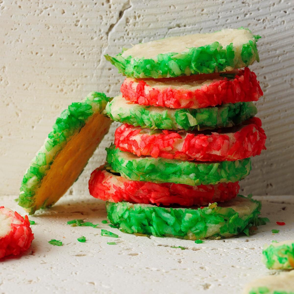 Tinting flaky white coconut reminds me of snowflakes falling under holiday lights. The reds and greens add colorful Christmas wonder....