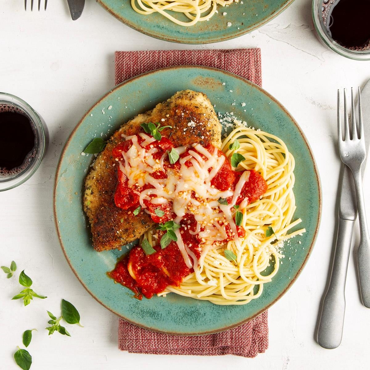 I like to make this yummy chicken Parmesan with spaghetti when I have extra sauce on hand. The herbed coating...