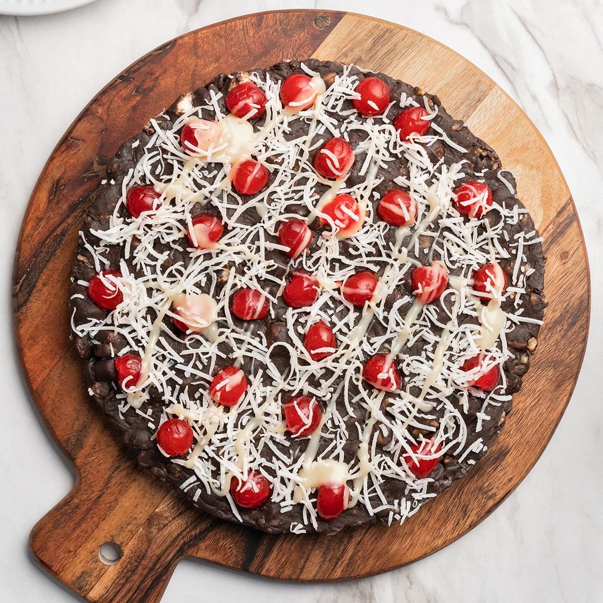 This decadent chocolate pizza has an indulgent, chewy and crunchy chocolate base topped with sweet cherries, fruity coconut and a...