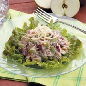 I dress up tuna salad deliciously with apple, raisins, dates and walnuts, then I drizzle it all with a tangy...