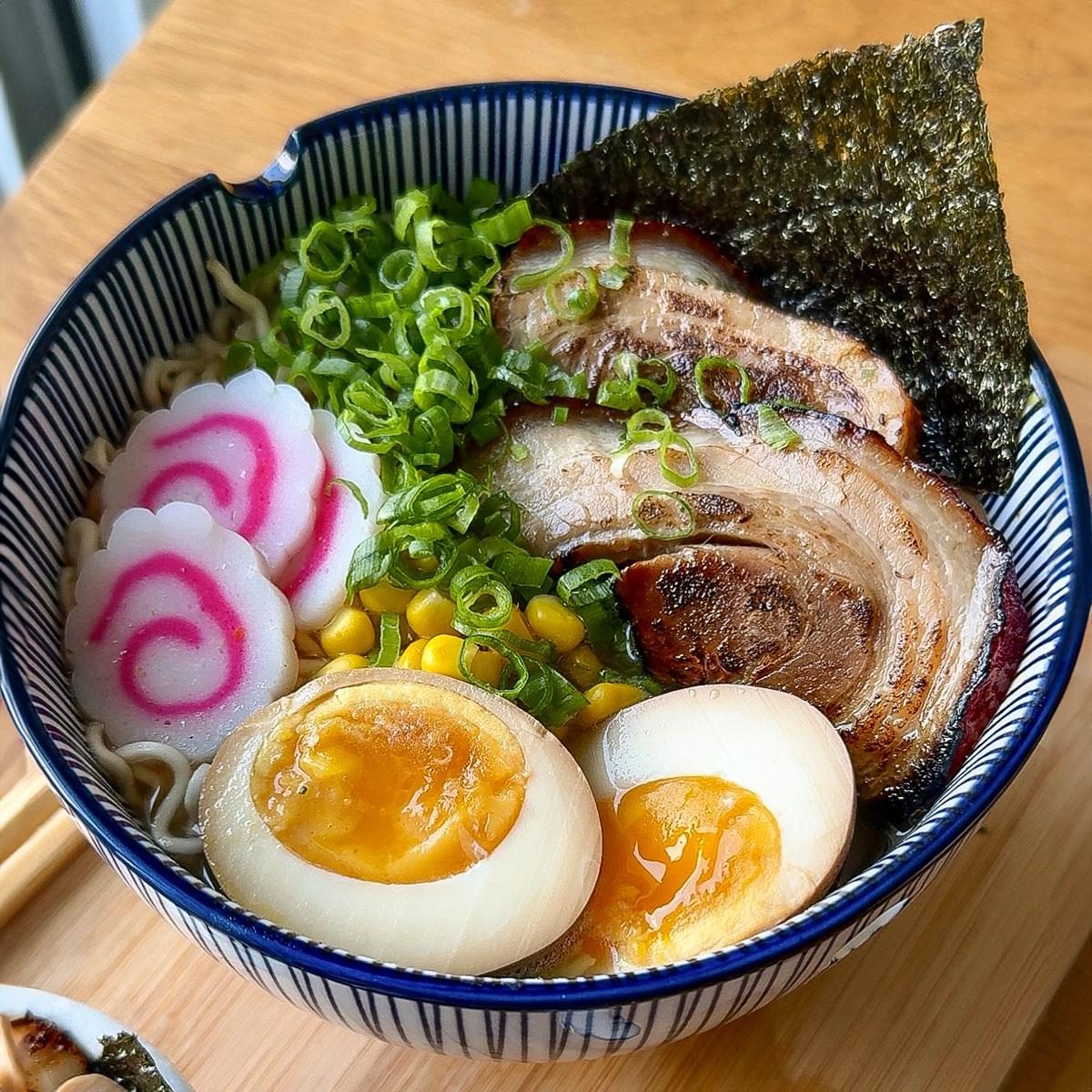 Umami in a bowl! Super tender braised chashu pork slices with a rich broth, bouncy noodles, and a jammy and...