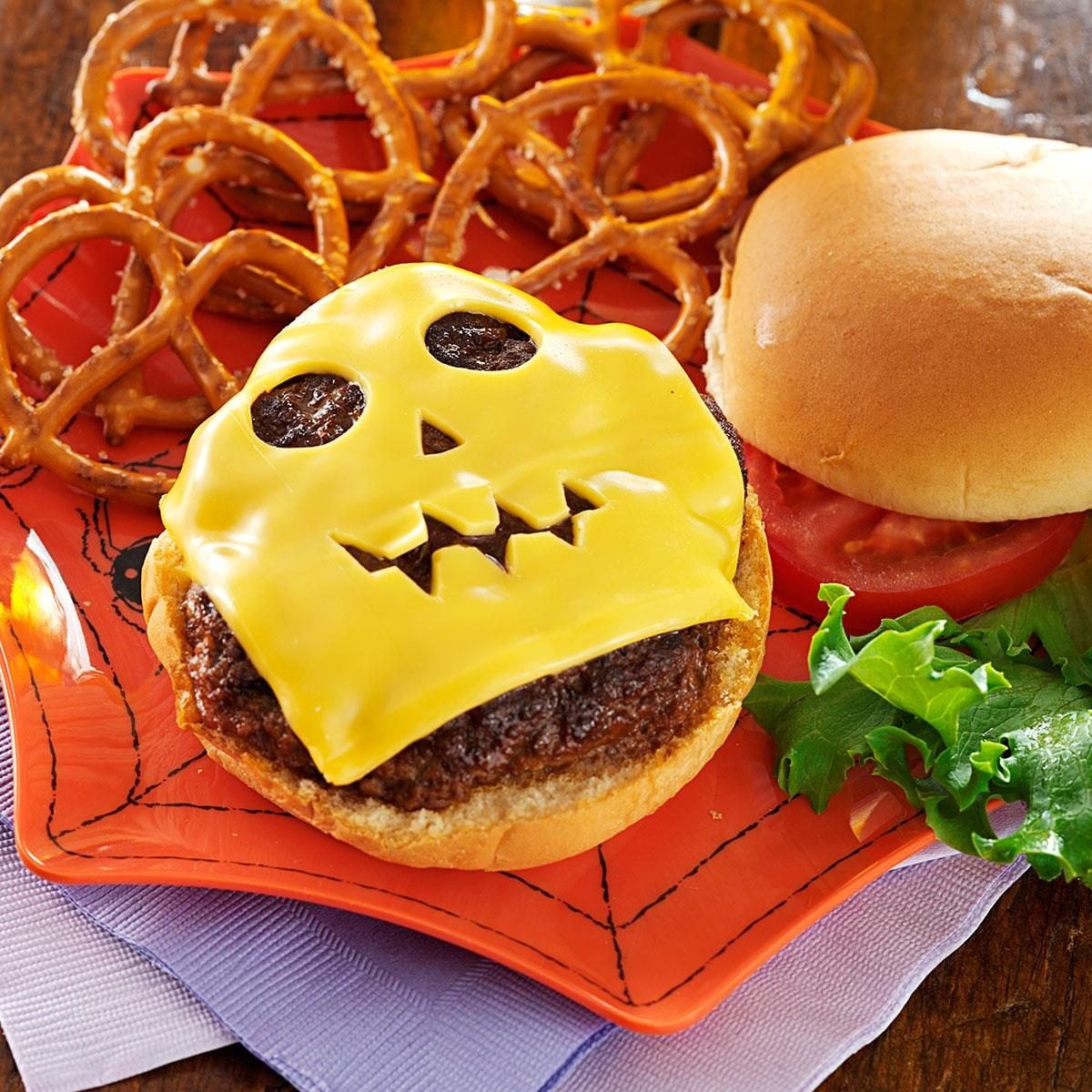 It's fun to "carve" cheesy faces on these nicely seasoned burgers I served at my Halloween theme party. Hungry trick-or-treaters...