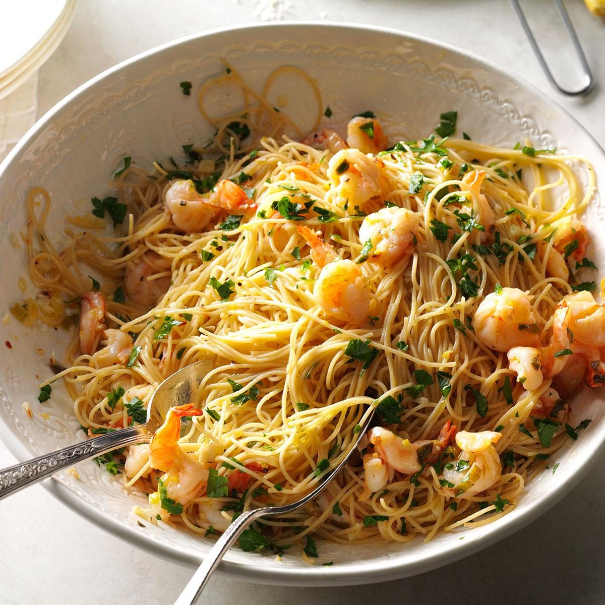 Served with a salad and garlic bread toast, this garlic shrimp spaghetti makes a tasty dinner. —June Foote, Spring Hill,...