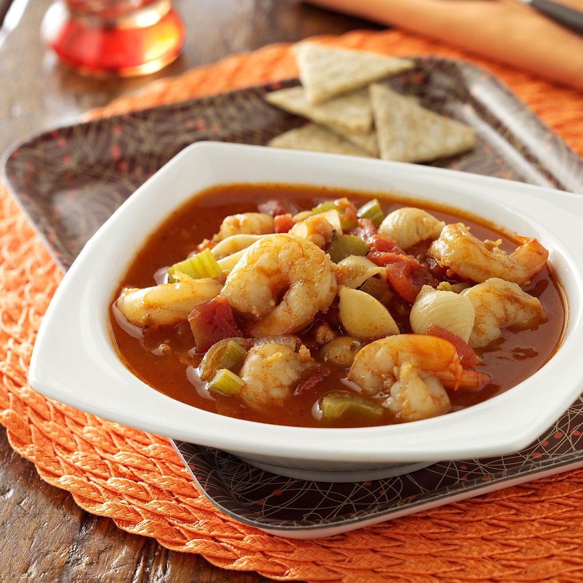 This spicy soup, featuring shrimp, crabmeat and tomatoes, gets its zip from hot pepper sauce and cayenne pepper. It's easy...