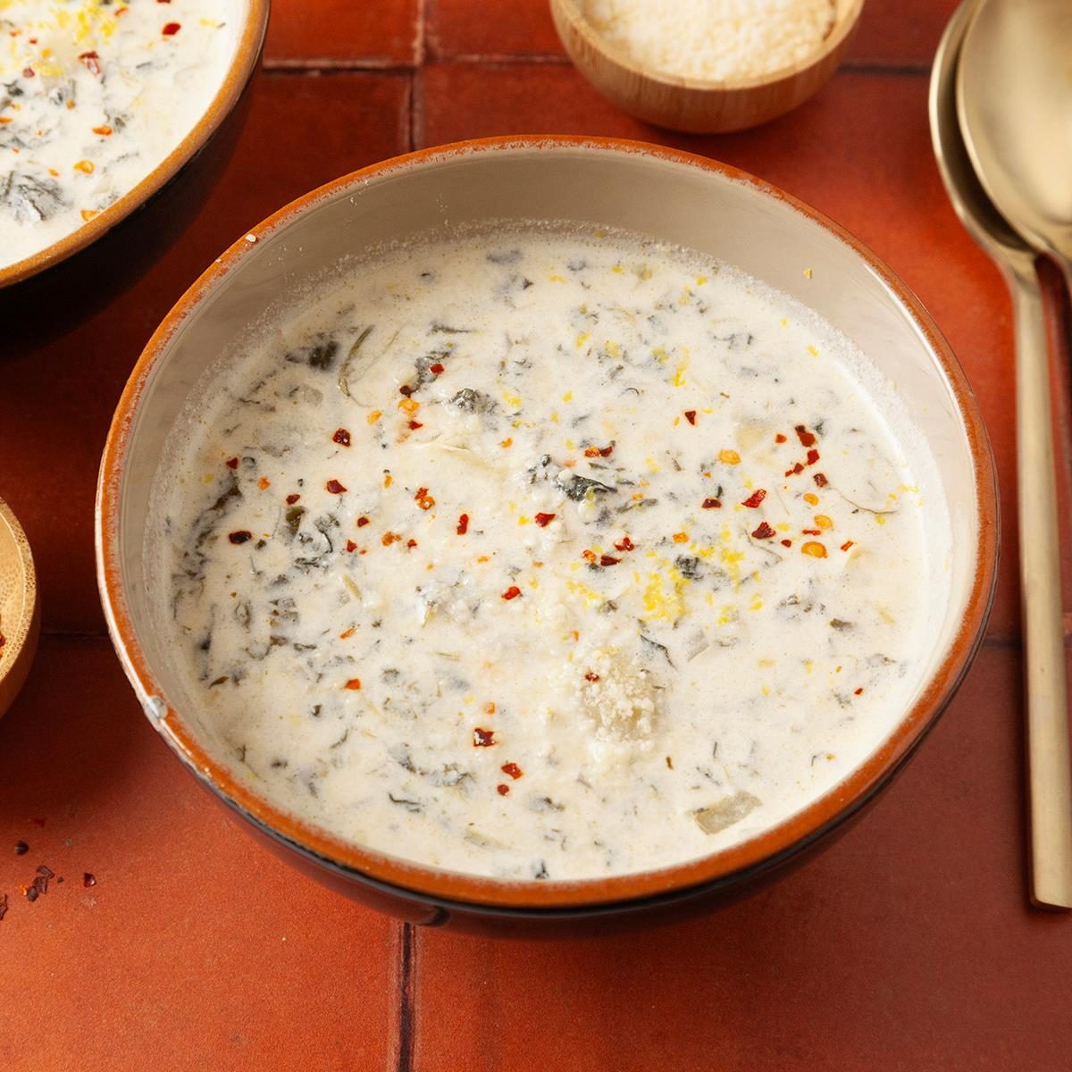 This spinach artichoke dip soup transforms creamy and cheesy spinach artichoke dip into a rich, veggie-packed, bright and brothy soup.