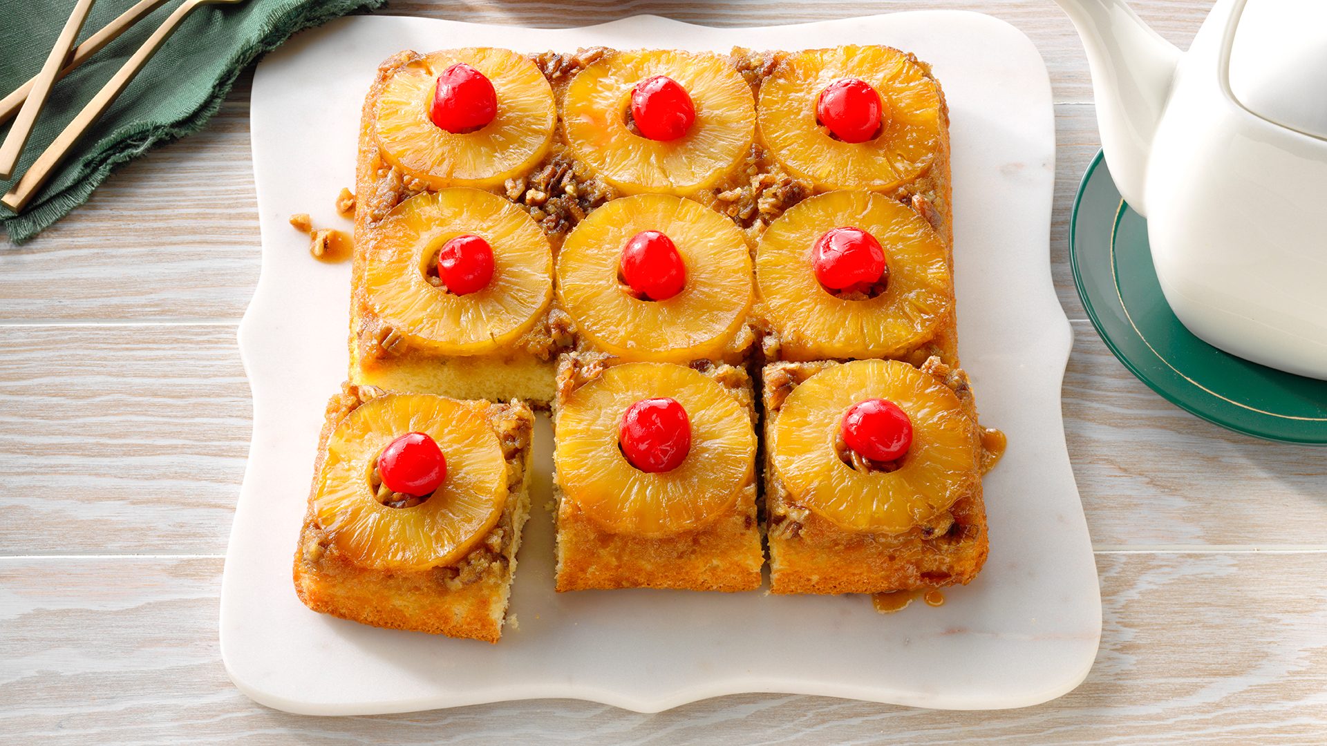 Thereās something about this upside-down cake’s soft layer of sponge and gooey pineapple glaze that transports us to holiday heaven.